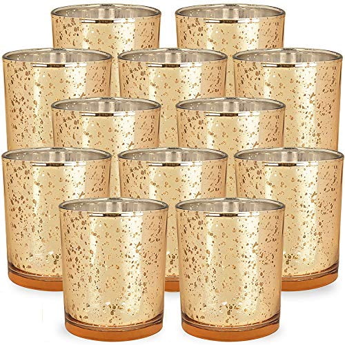 Round gold votive candle holders bulk, mercury glass tealight candle holder set of 12 for wedding decor and home decor.